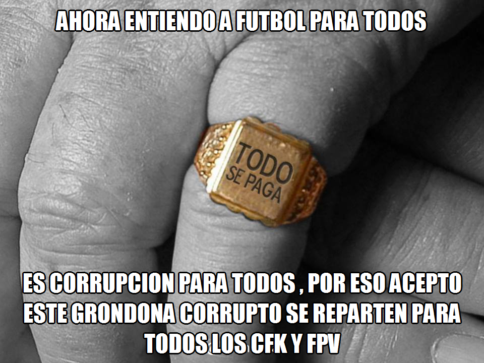 KaranchosaidLos jugadores de futbol son unos analfabetos que lo único que saben hacer es patear una cosa redonda de cuero, mientras nosotros les pagamos una fortuna a través del desgraciado “Fútbol para Todos”para la publicidad de los KK. Después de 10 años KK, nuestra otrora grandiosa nación quedó reducida a los eskombros producidas por políticos corruptos, prostitutas, barrasbravas manejadas por lo polítikos coruptos, jugadores de fútbol, directores técnicos coimeros, faranduleros prostituidos y drogados y narcotraficantes con sus ejércitos de vagos planeros nacionales y paraguayos, bolivianos, peruanos, colombianos y mexicanos. Dios Nos libre de toda esta escoria que dejarán los KK. |