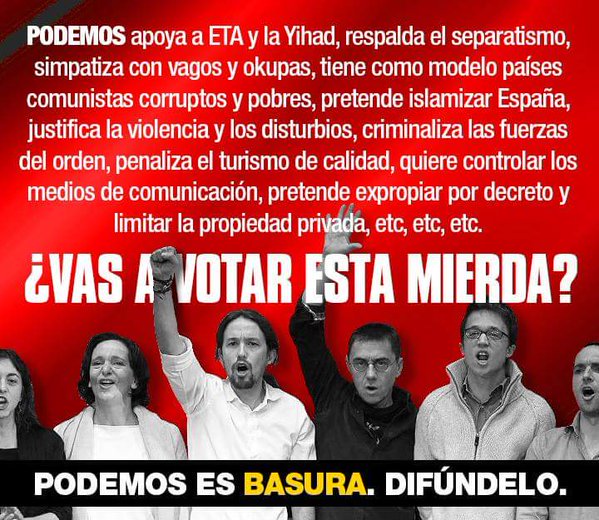 TitaniasaidEs una auténtica vergüenza que Podemos tenga 60 diputados en el congreso y que el resto de partidos lo permitan. No puede ser que un partido que habla de ETA como una organización política y no dice lo que realmente es, una Banda Terrorista que ha asesinado a cerca de mil personas y herido a muchas más; que habla de Arnaldo Otegui como un preso político y no como un político que ha estado preso por apoya a una banda terrorista; que quiere la independencia de Cataluña del resto de España y tras ella el resto de comunidades; que quiere instaurar el régimen venezolano en España, un régimen que tiene a los venezolanos en la miseria absoluta, que insultan, mienten, faltan el respeto presentandose como gentuza en el congreso, etc, etc. y nadie hace nada. Absolutamente nadie se atreve a decirles que algunas de las cosas que proponen para nuestro país son ilegales, y que los españoles ni queremos a ETA, ni queremos un régimen autoritario porque ya lo vivimos, ni queremos que se independice nadie, sino vivir lo mejor posible todos juntos…… |