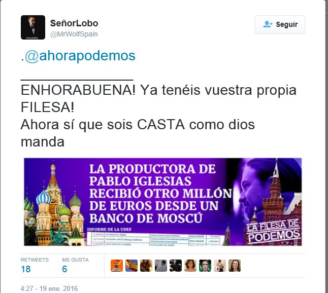 Usuariasaid“PODEMOS” ES UN GRUPO QUE PRETENDE UNA VENEZUELA CHAVISTA PARA ESPAÑA Un documento firmado en 2008 por el ministro de Finanzas del gobierno venezolano, Rafael Isea, muestra el pago de más de siete millones de euros a la fundación Centro de Estudios Políticos y Sociales (CEPS), germen de Podemos, para, entre otras cuestiones, extender el movimiento bolivariano en España. El citado documento, al que han tenido acceso medios como El Confidencial y ABC, obra en poder de la Unidad de Delincuencia Económica y Fiscal (UDEF) de la Policía Nacional, que investiga desde el pasado mes de noviembre una presunta financiación ilegal de Podemos. Los pagos a la fundación, de los que fueron beneficiarios directos Pablo Iglesias, Juan Carlos Monedero y Jorge Verstrynge (según El Confidencial) se desglosan en varios plazos: uno de 1,6 millones de euros en 2008 y 2,8 millones más en el período 2009-2012. Estas cantidades se sumarían a los más de tres millones de euros recibidos anteriormente por el CEPS por otros trabajos de asesoramiento al gobierno bolivariano hasta 2012. Podemos se registró como partido en enero de 2014 para poder presentarse a las elecciones europeas de ese año, y a la posterior carrera electoral de 2015, cuando se celebraron las elecciones andaluzas, municipales y autonómicas, catalanas y generales. Buscaban “cambios políticos” en España afines a Venezuela |